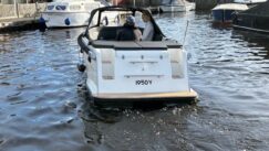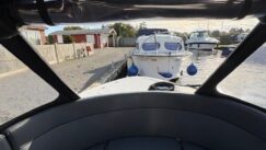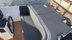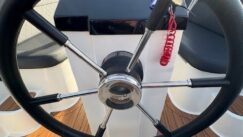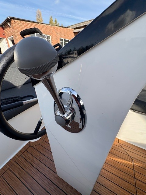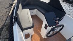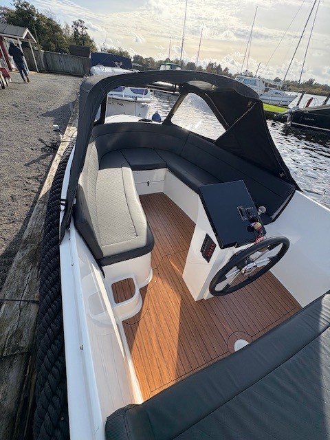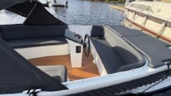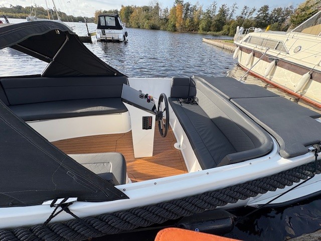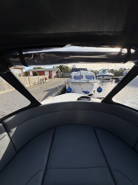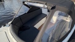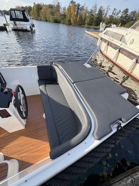 The sprayhood and tonneau cover is carbon grey and matches the seating upholstery: upgraded luxury quilted in ‘Diamand’ Carbon and includes the sunbed in-fill and cushion. The boat comfortable seats 8 people.