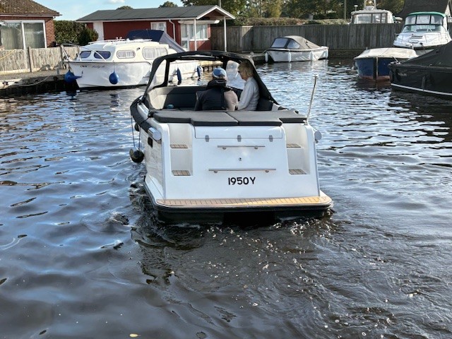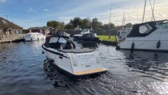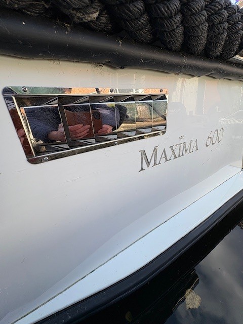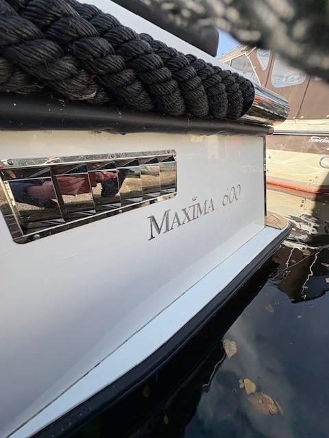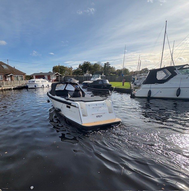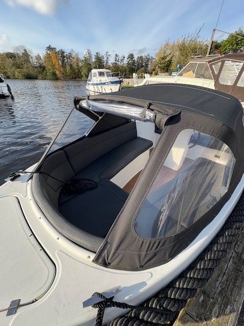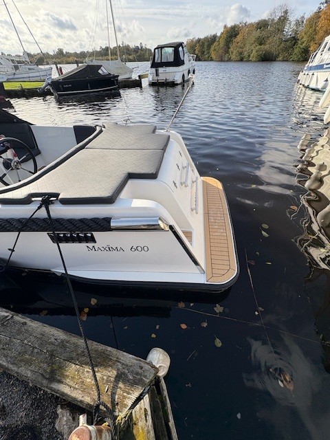 Beautifully co-ordinated (2020) Maxima 600 for sale. The Maxima 600 has the characteristic fender rope in black with a white hull and decks. This model has the outboard in the ‘bun’ which means the engine is very quiet enabling you to enjoy the peaceful waterways and offers protection from the propeller.